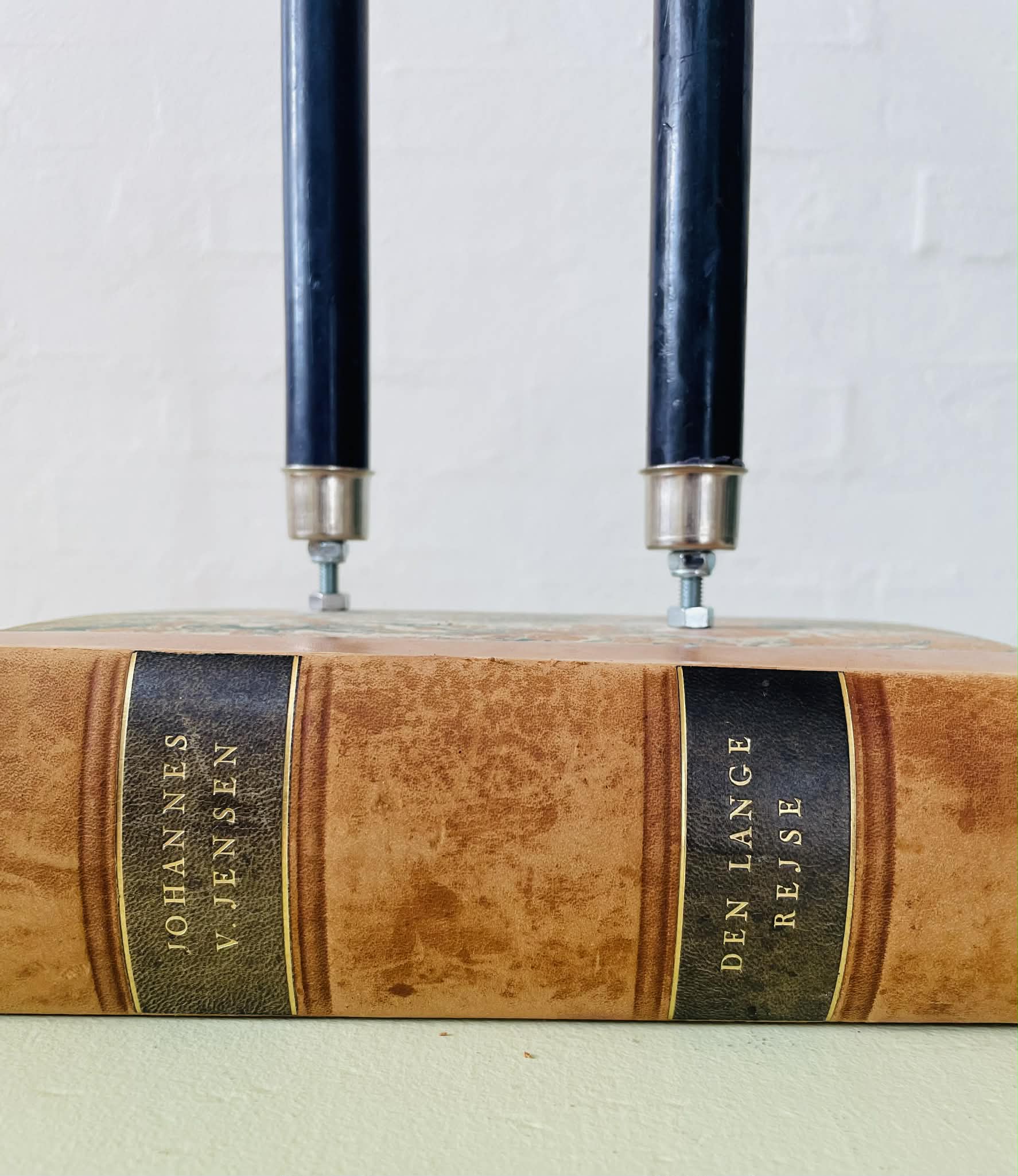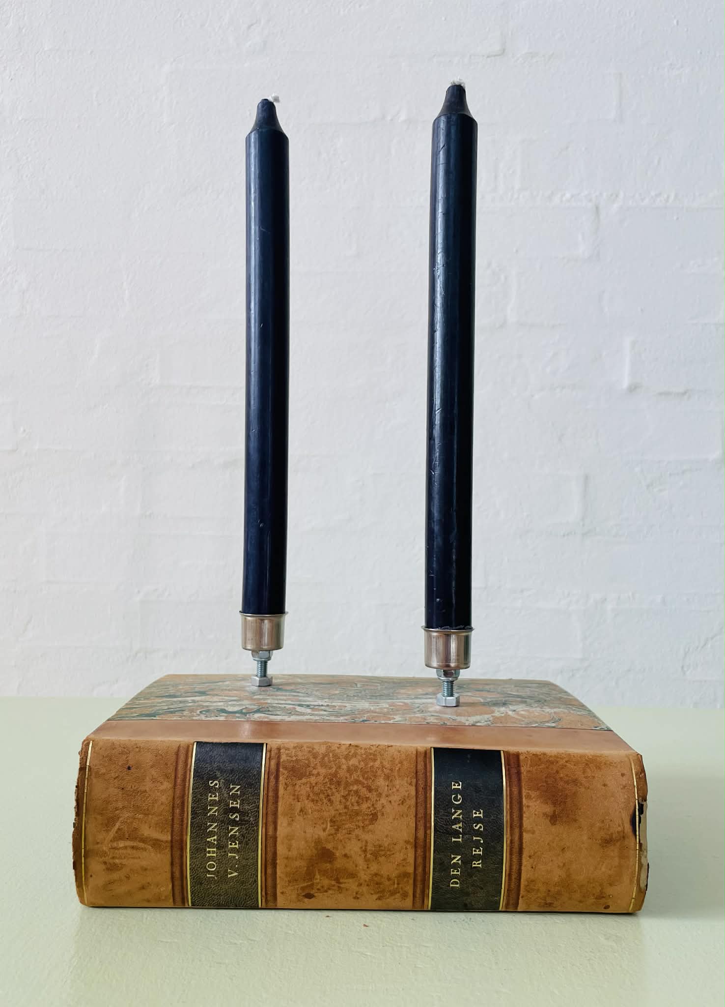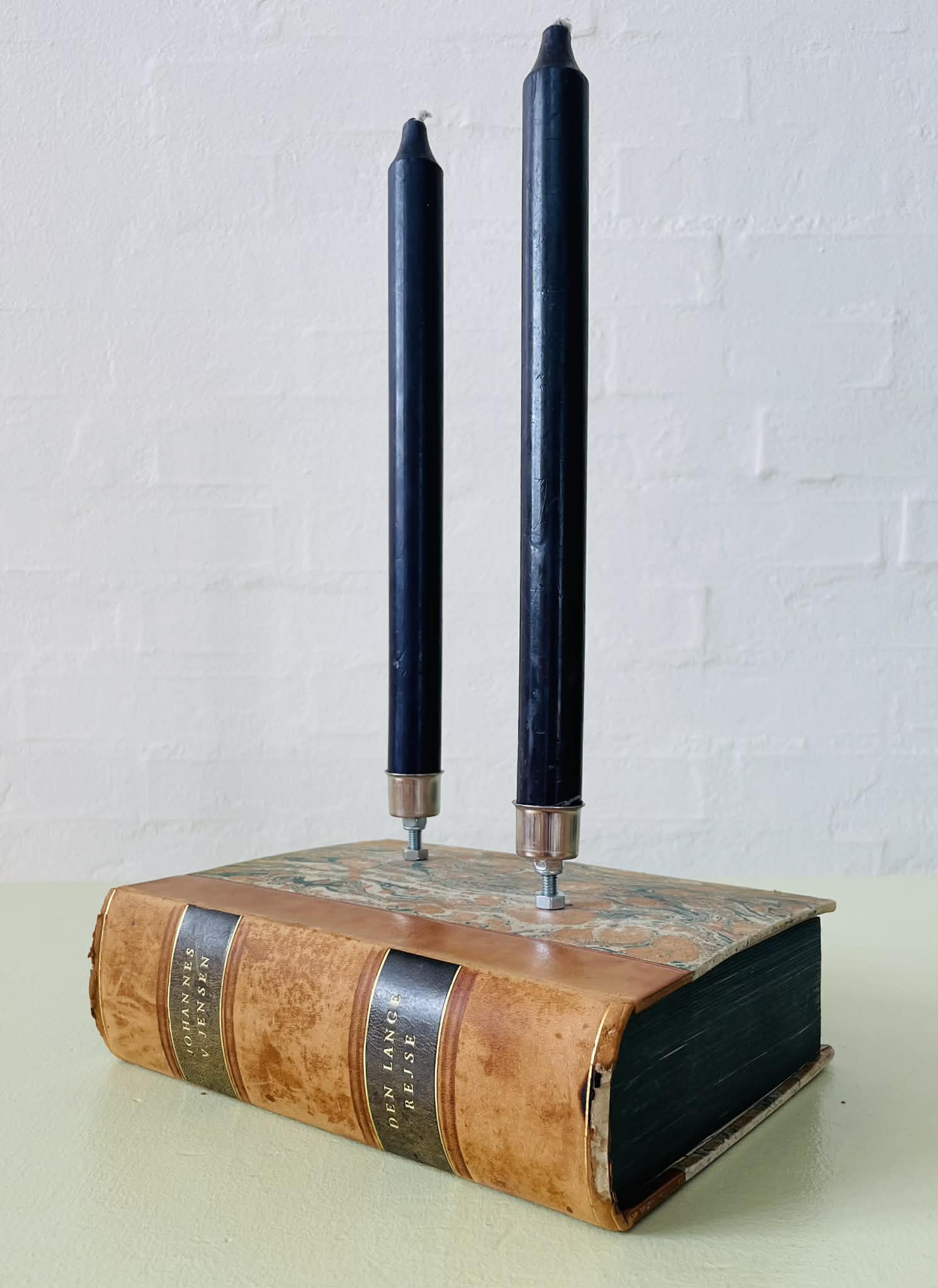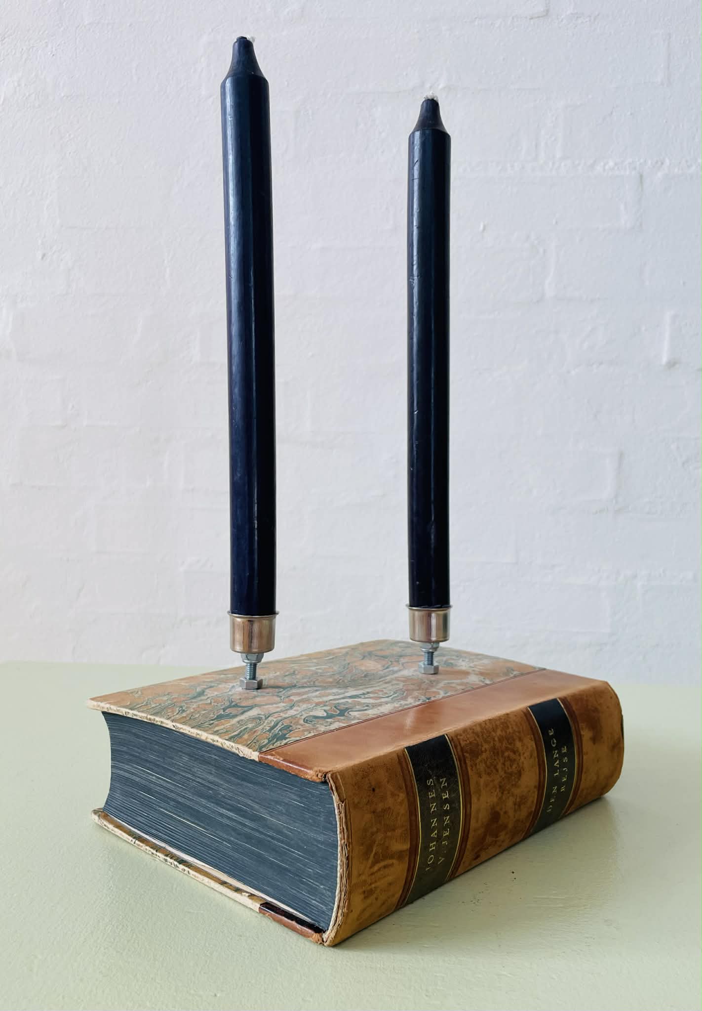 Boglysestage lavet af en fin, ældre bog og to lysholdere i metal til alm. størrelse stearinlys. Siderne er lakeret sammen, så man ikke kan åbne bogen. Bogen er af ældre dato, så den har masser af patina, hvilket kun gør den endnu mere hyggelig. Forfatter: Johannes V. Jensens “Den lange rejse”. Sælges uden stearinlys.