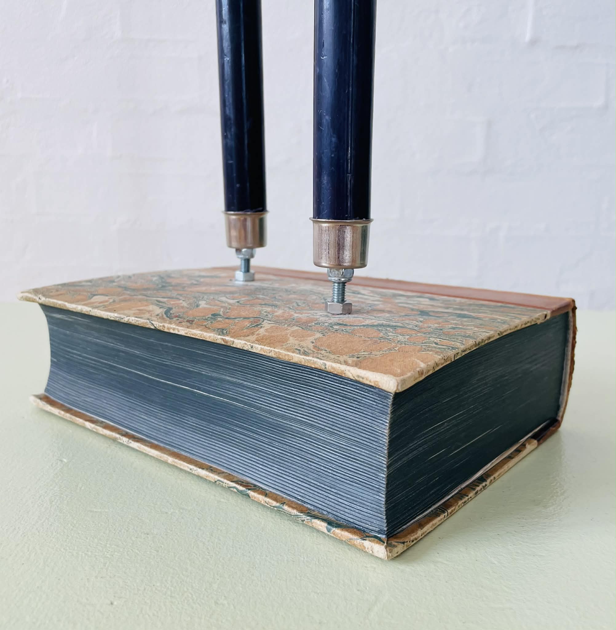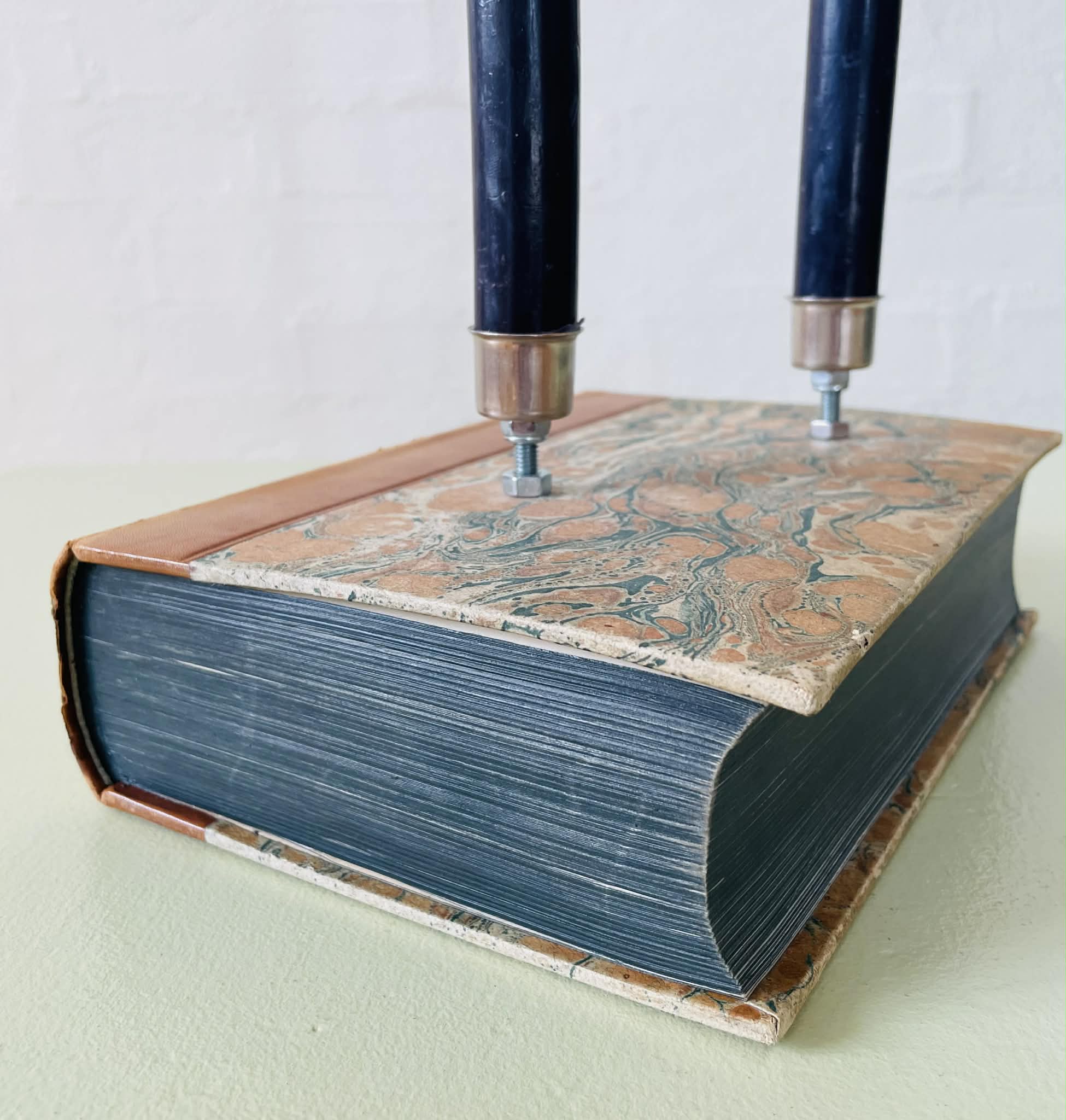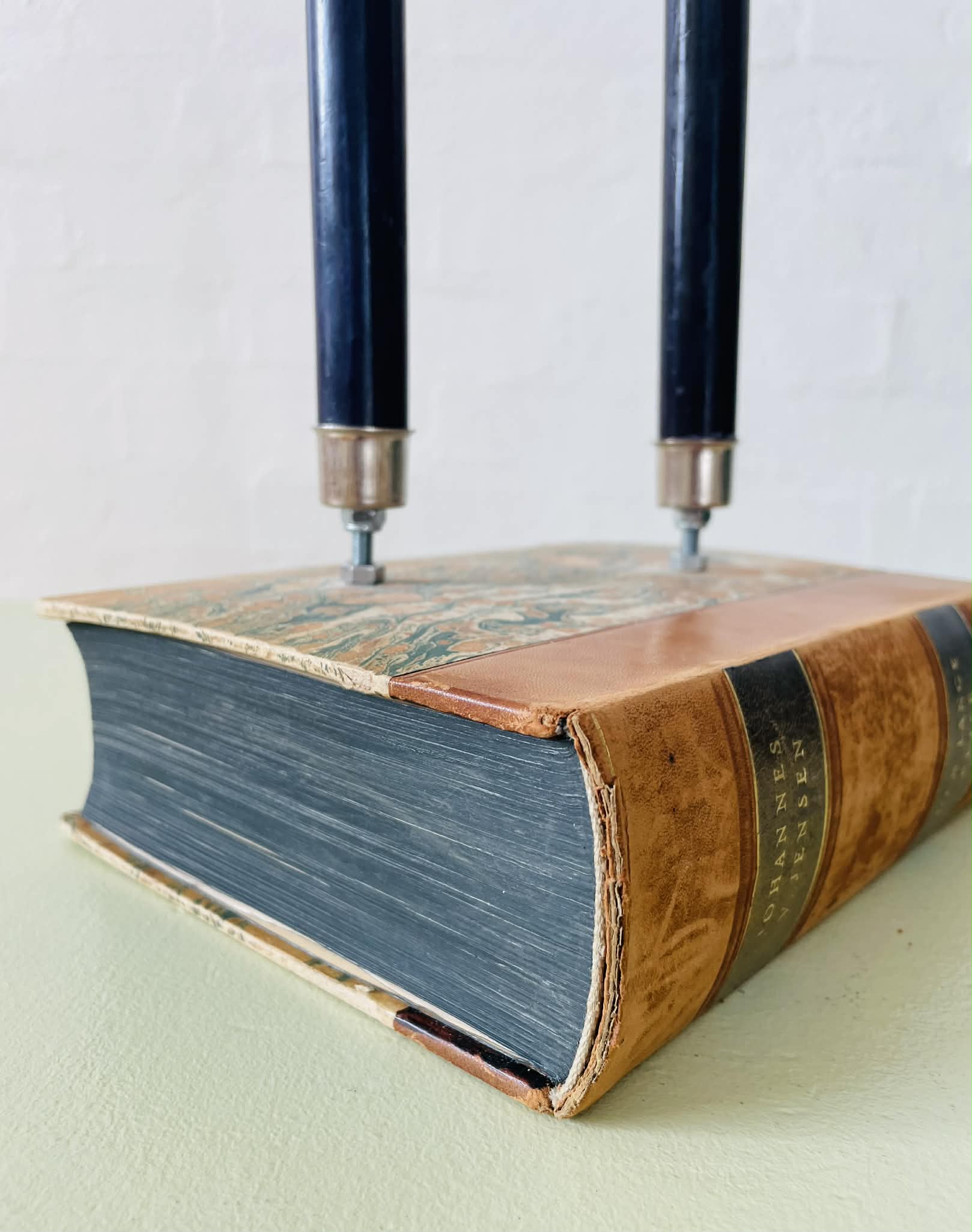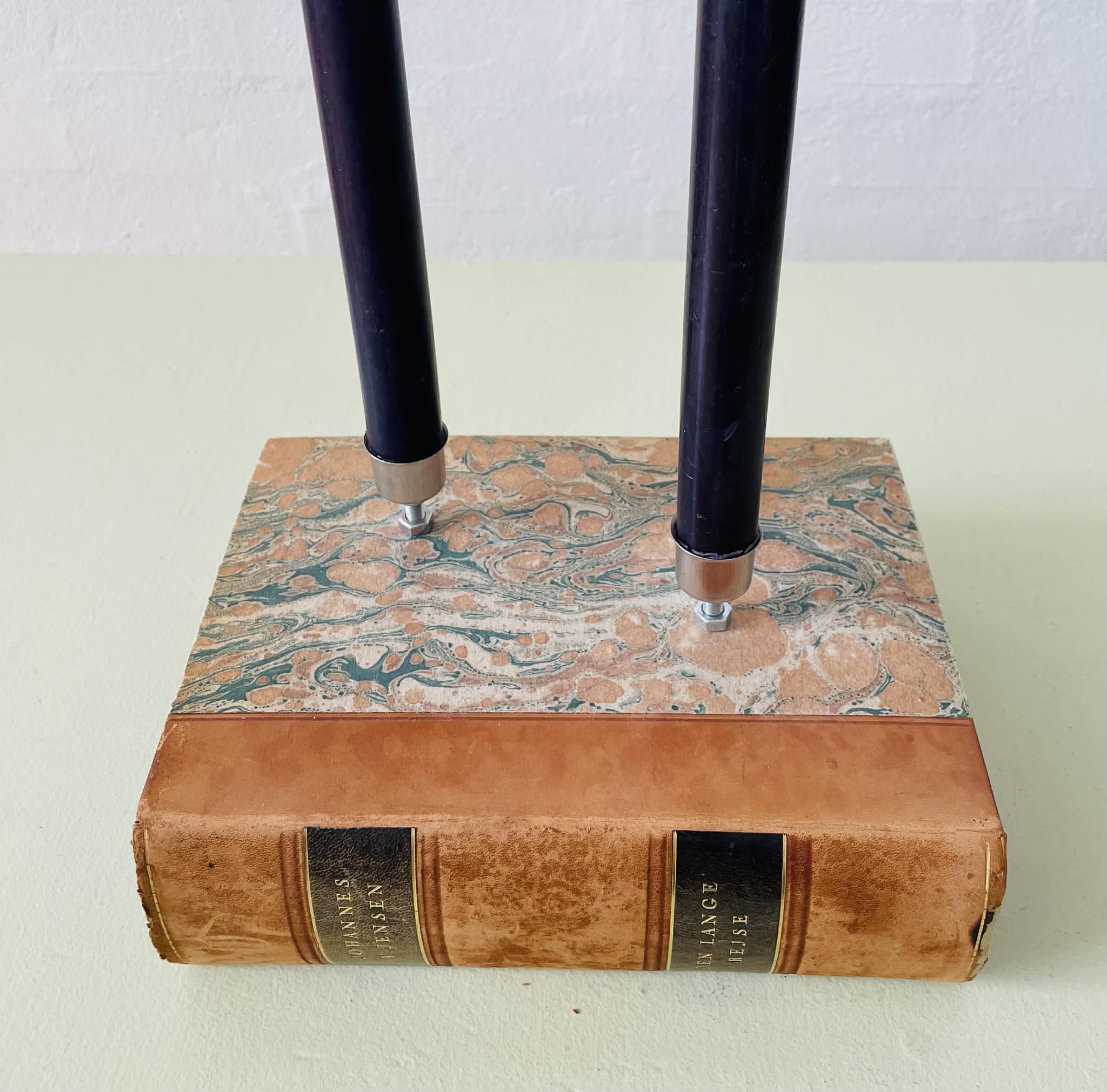Boglysestage lavet af en fin, ældre bog og to lysholdere i metal til alm. størrelse stearinlys. Siderne er lakeret sammen, så man ikke kan åbne bogen. Bogen er af ældre dato, så den har masser af patina, hvilket kun gør den endnu mere hyggelig. Forfatter: Johannes V. Jensens “Den lange rejse”. Sælges uden stearinlys.