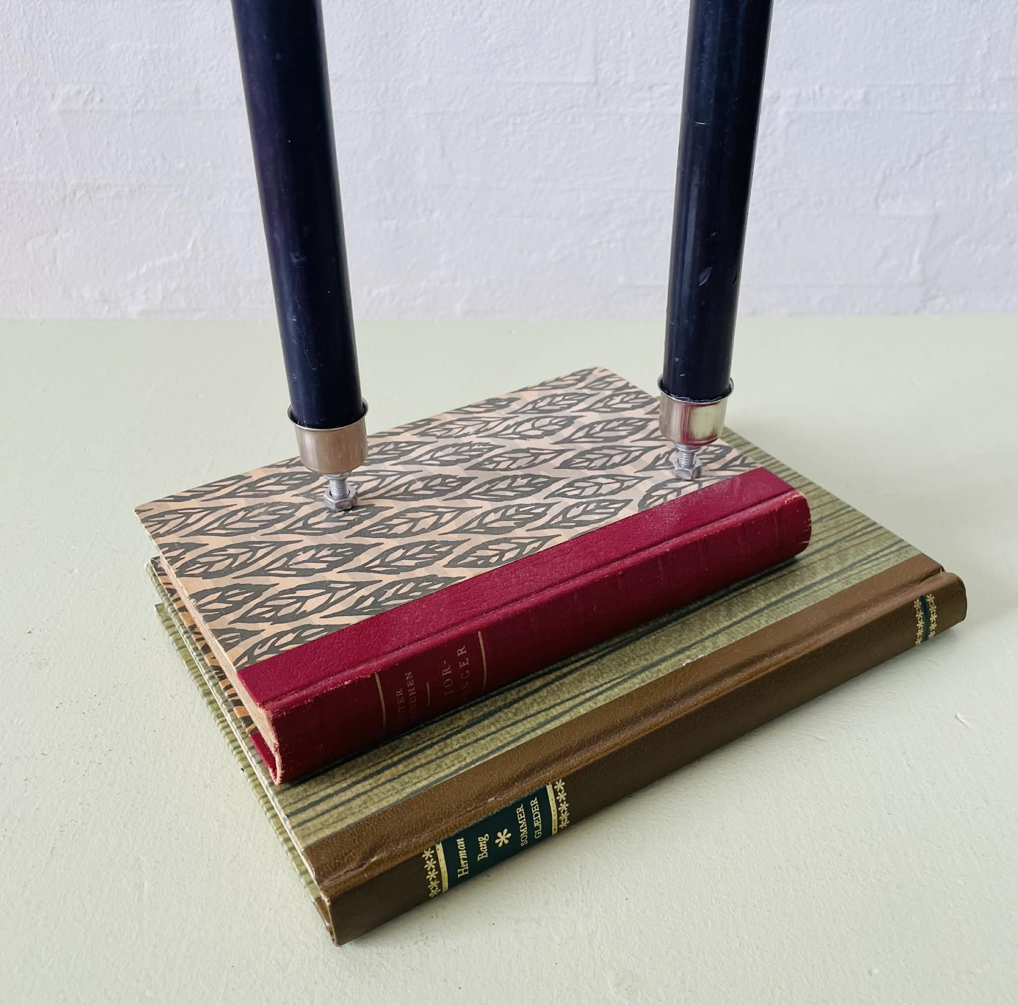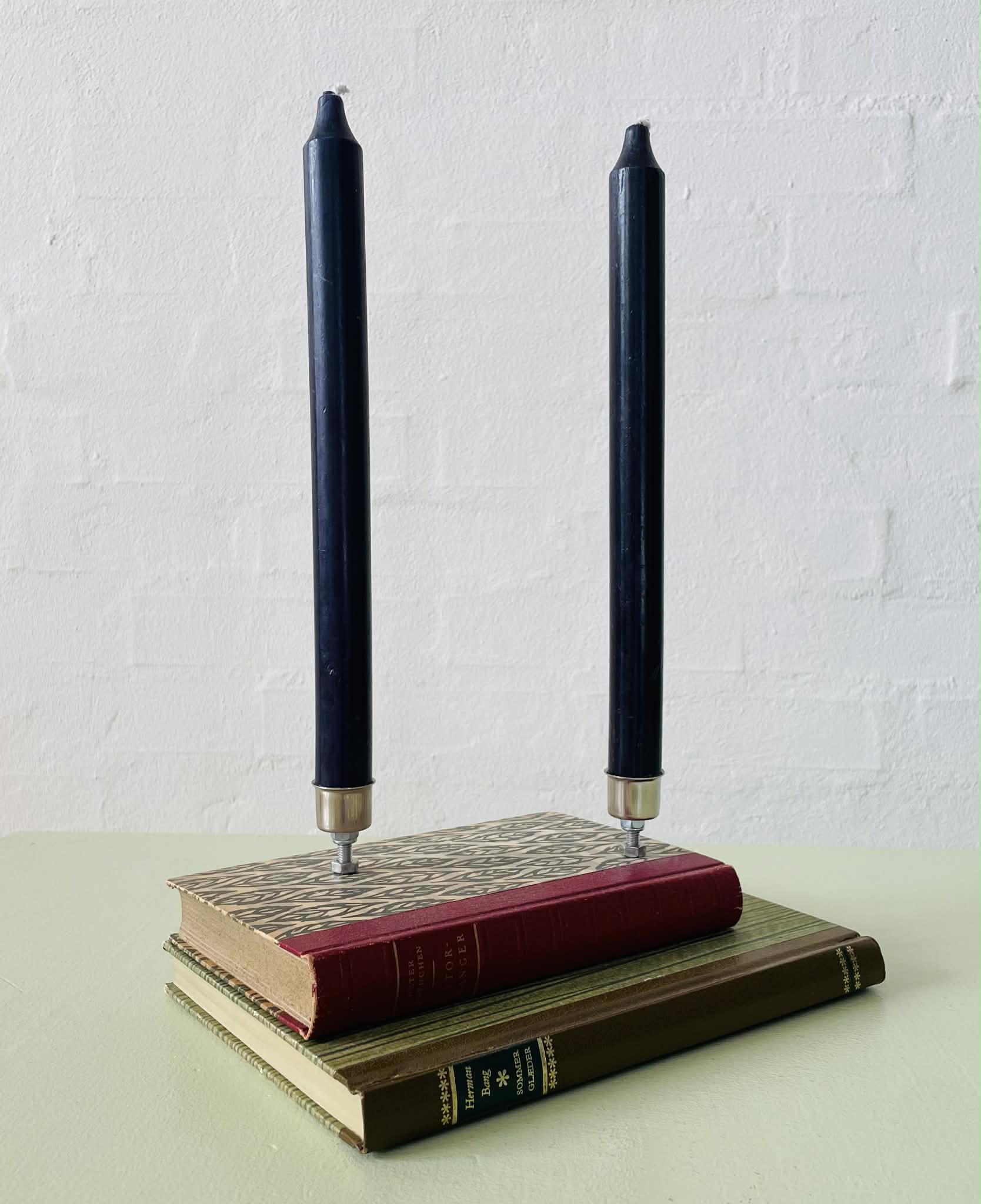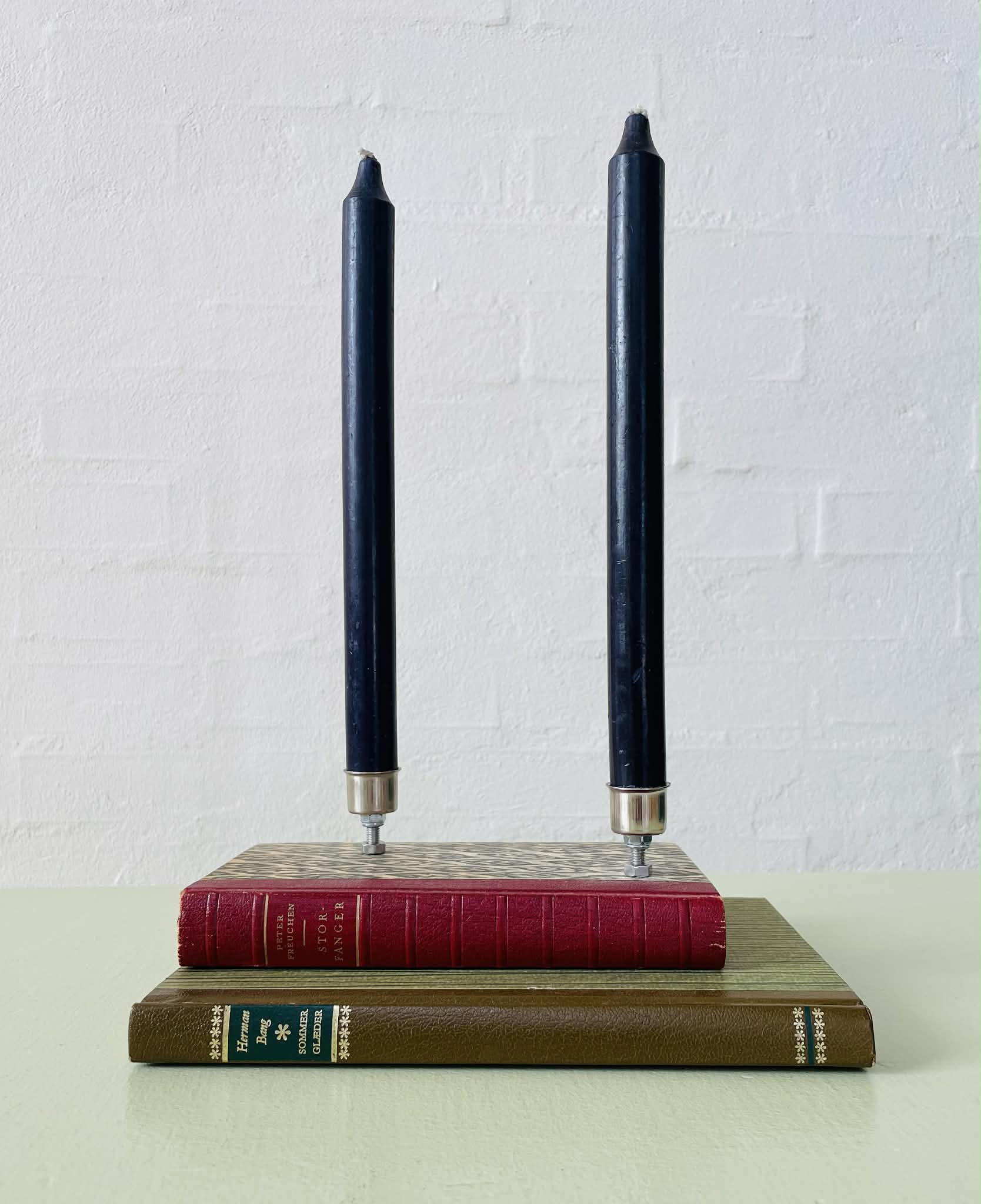 Boglysestage lavet af to fine, ældre bøger (Peter Freuchens “Storfanger” og Herman Bangs “Sommerglæder”) og to lysholdere i metal til alm. størrelse stearinlys. Siderne er lakeret sammen, så man ikke kan åbne bøgerne. Bøgerne er af ældre dato, så de har masser af patina, hvilket kun gør dem endnu mere hyggelig. Sælges uden stearinlys.