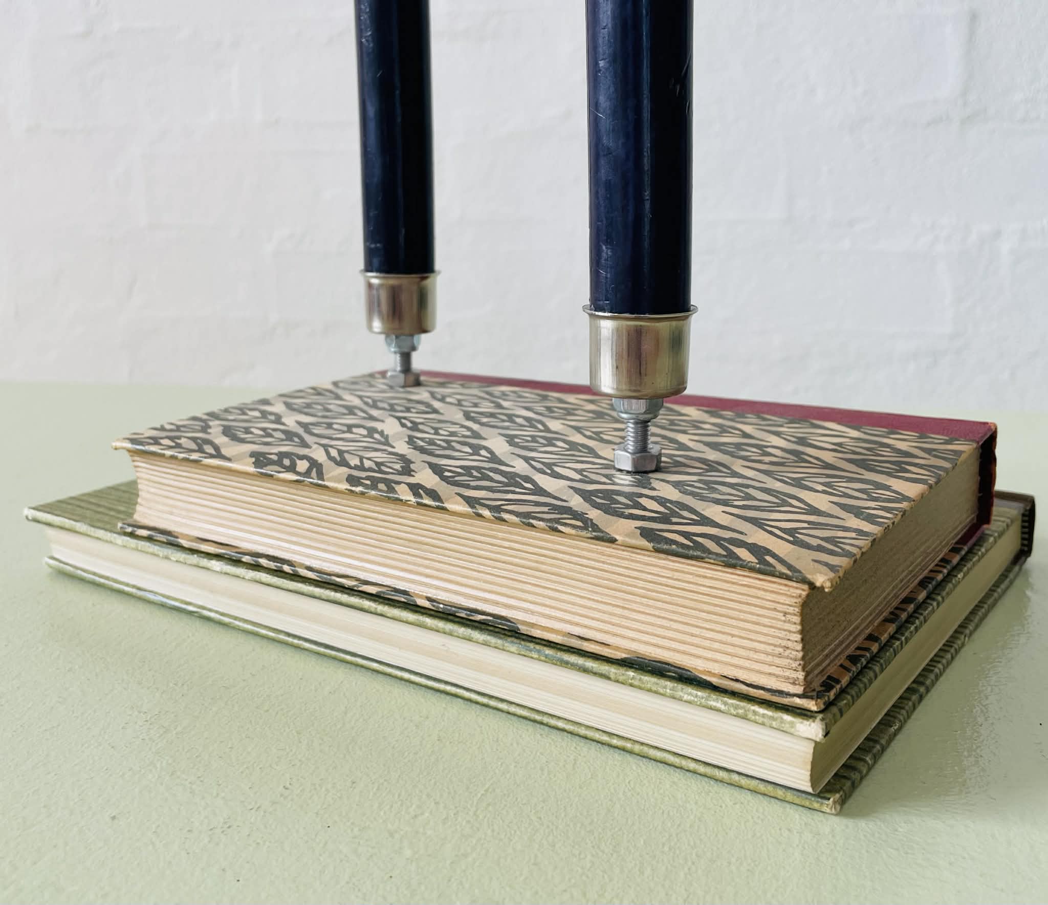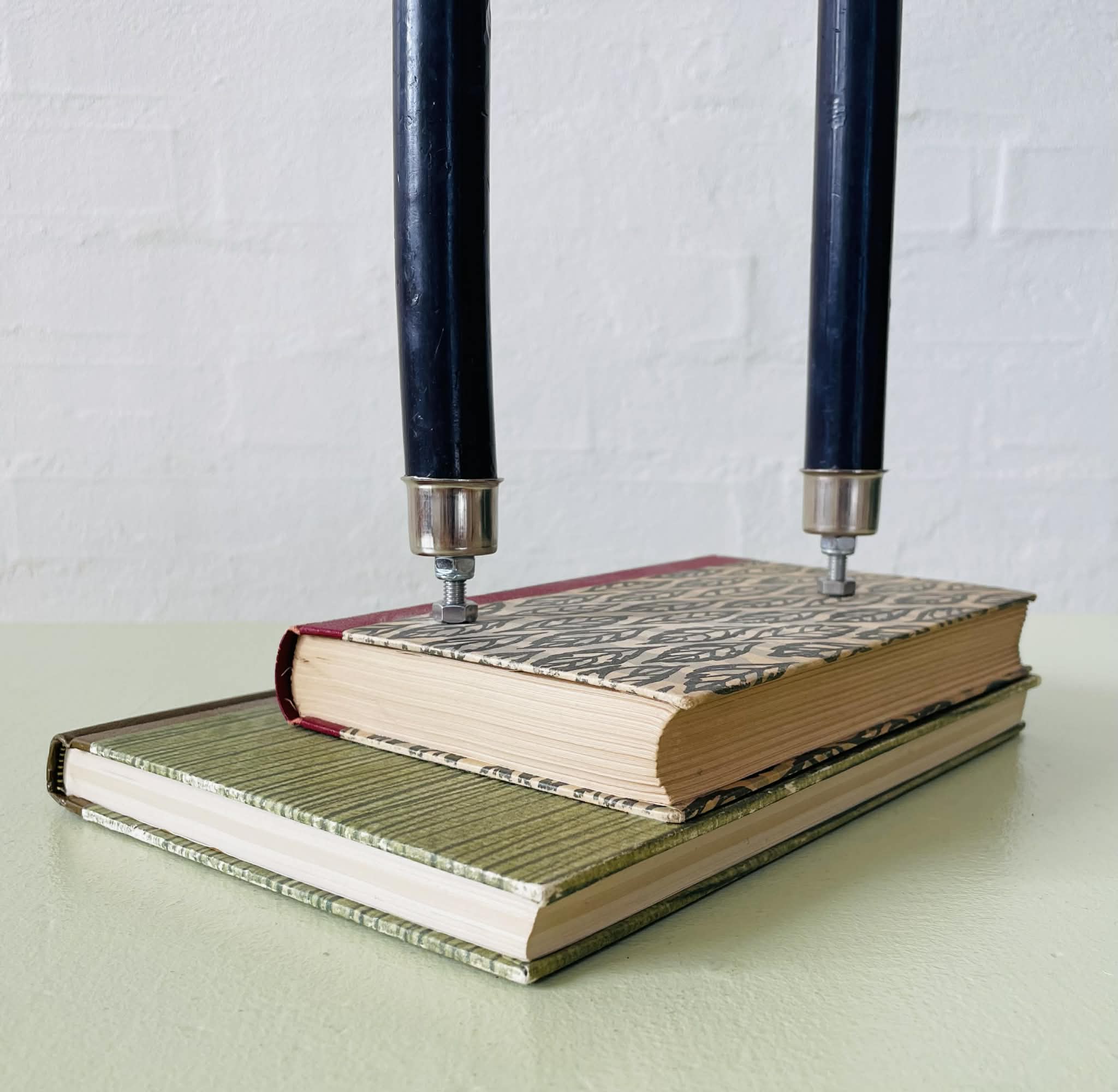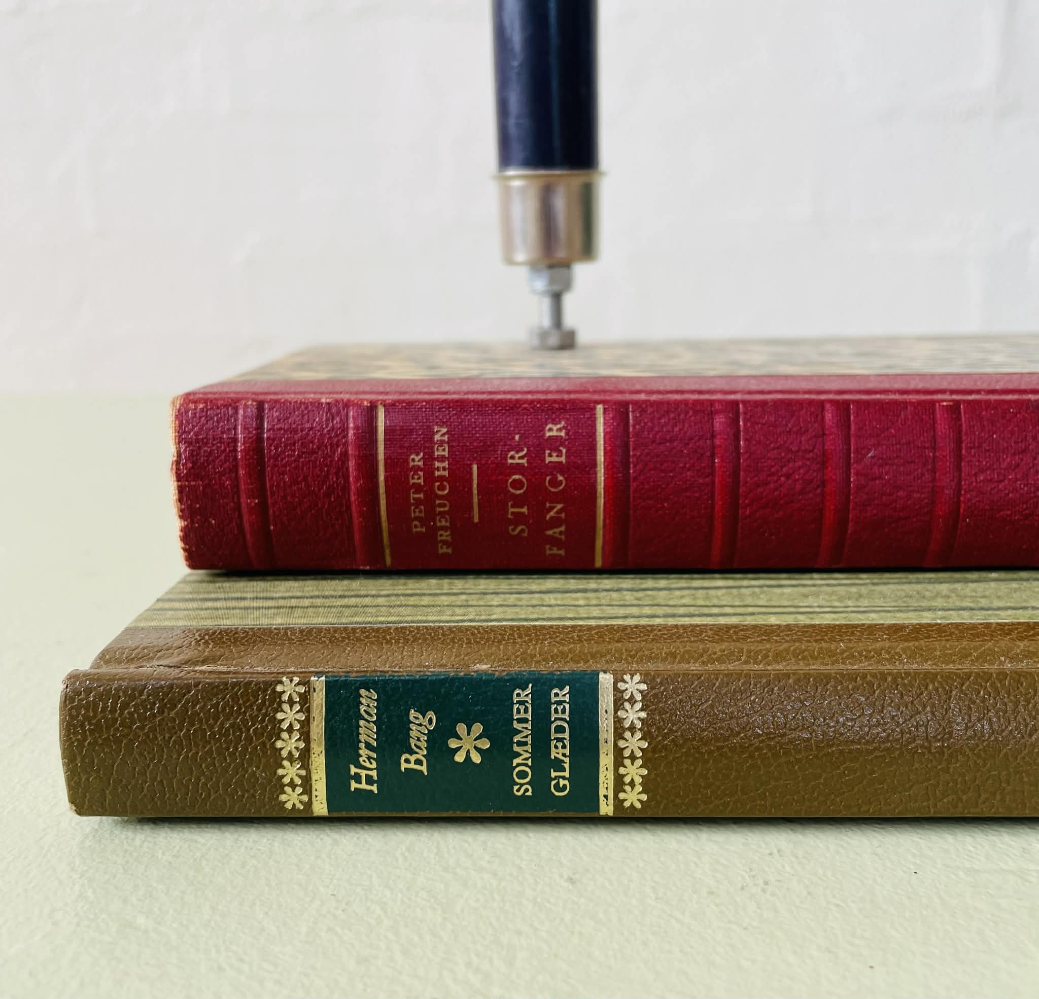Boglysestage lavet af to fine, ældre bøger (Peter Freuchens “Storfanger” og Herman Bangs “Sommerglæder”) og to lysholdere i metal til alm. størrelse stearinlys. Siderne er lakeret sammen, så man ikke kan åbne bøgerne. Bøgerne er af ældre dato, så de har masser af patina, hvilket kun gør dem endnu mere hyggelig. Sælges uden stearinlys.